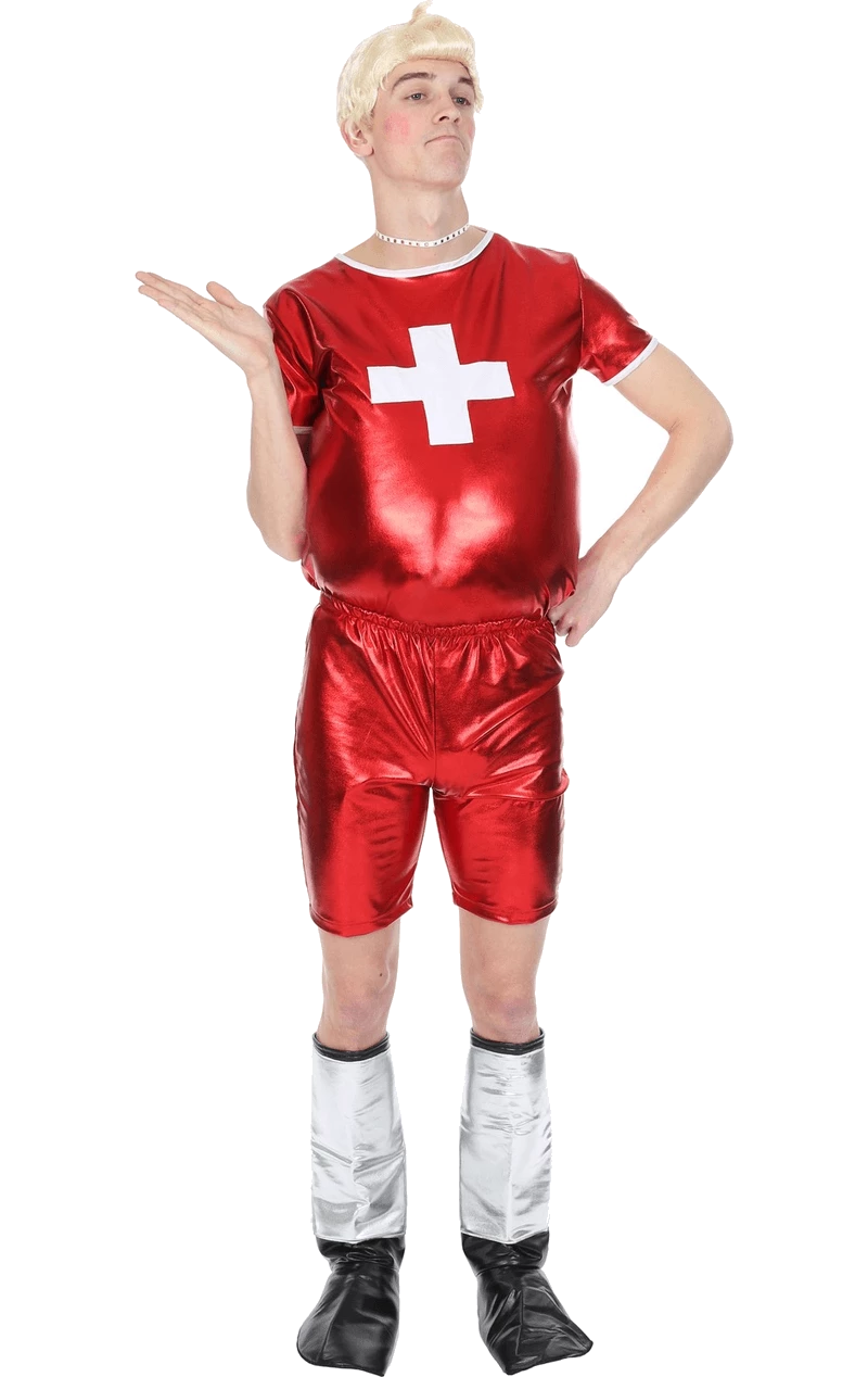 The Adult Daffyd Thomas TV Costume features figure-hugging, metallic finish red shorts, plus a matching top with a white cross printed on the front. The costume also comes with silver and black metallic boot covers, a platinum blonde wig and a silver choker. You’ll look exactly like good old Daffyd!