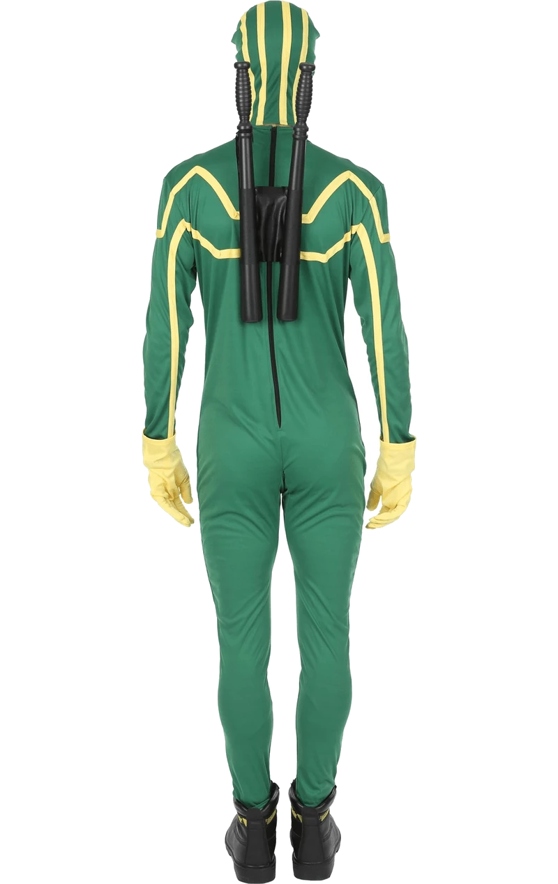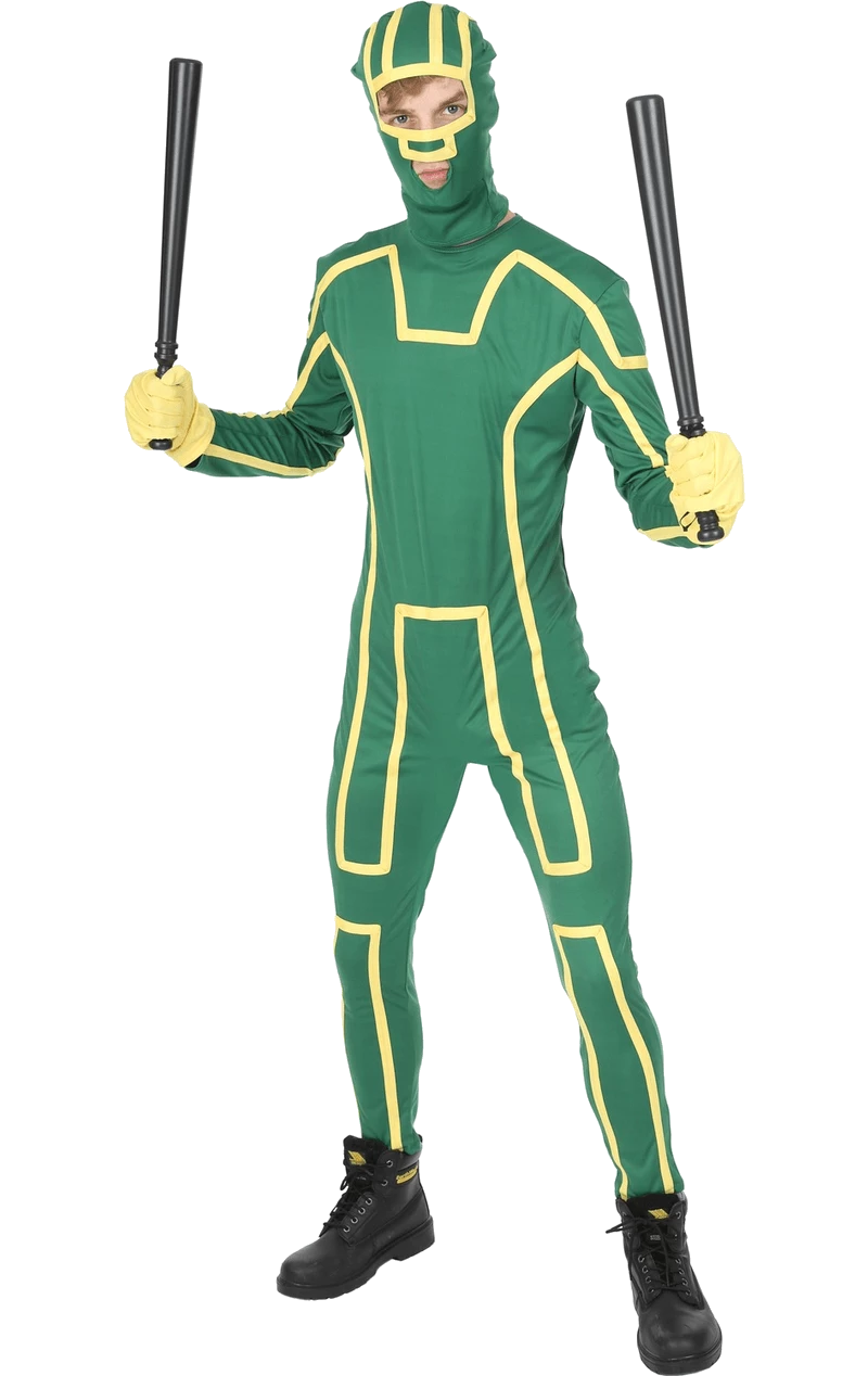 With its all-in-one green jumpsuit with yellow pattern detailing on the front, the Adult Kick Ass Costume is a perfect choice for those who want to show off their moves in front of their friends. It comes with a matching headpiece with eyeholes, a pair of batons and yellow gloves.