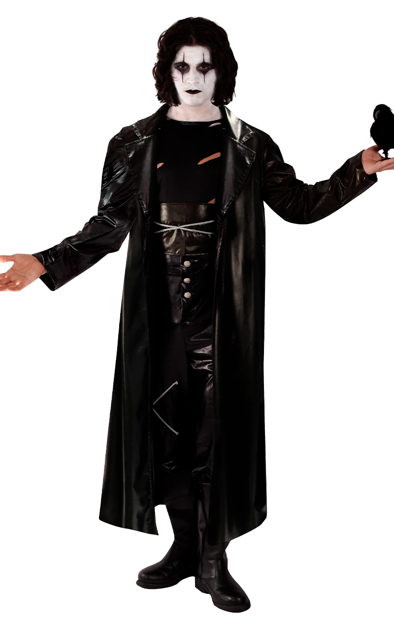The Adult The Crow Movie Costume is made up of a leather-look black jacket with matching leather-look trousers. It also includes a black top and belt. All you need extra is some white and black face paint, creating the unique look of this devious movie character.