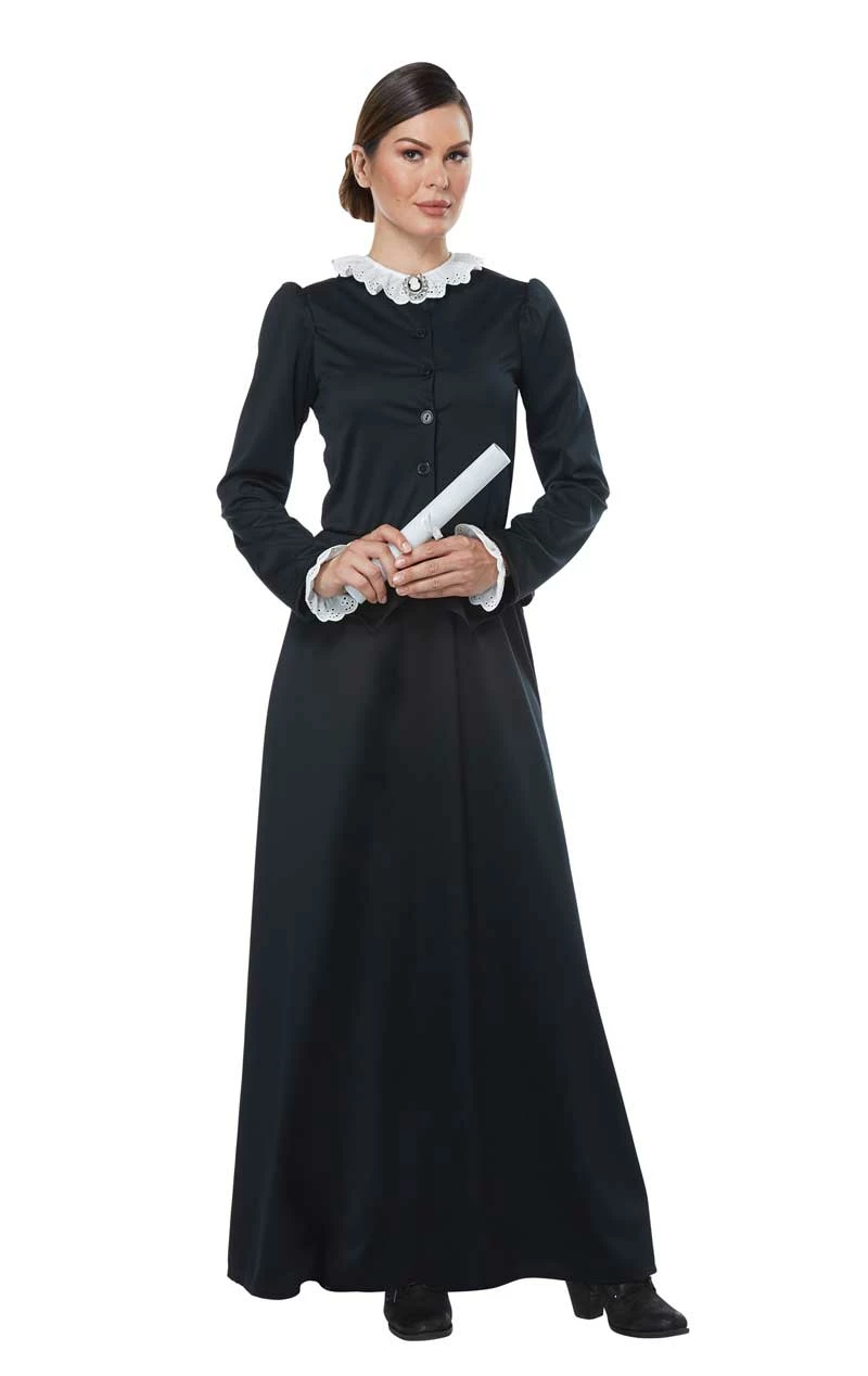 The Adult Susan B. Anthony/ Harriet Tubman Costume comes complete with a long sleeved, floor length black dress with an attached button-up jacket. The costume also includes a number of accessories that you can mix and match. It features a white lace collar, ruffled collar with bow, lace cuffs, a cameo and hair wrap.
