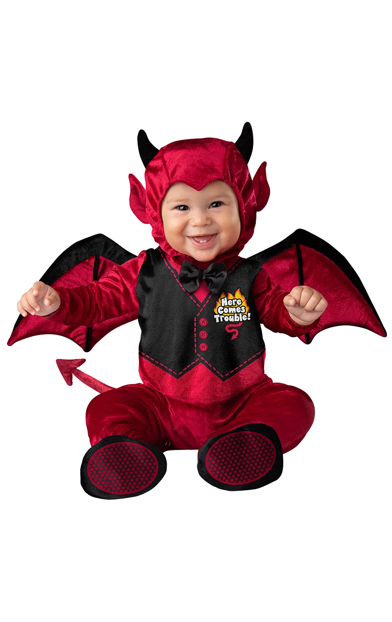 Our Lil Devil Baby Costume comes complete with an all-in-one onesie that’s of a dark red colour. It features a black waistcoat with the words, ‘here comes trouble,’ and includes a black bow tie. This comfortable onesie features non-slip feet, making it easy for your little one to crawl or walk around on their first night of trick-or-treating. The baby Halloween costume also comes with detachable wings, and a character hood with black devil horns.