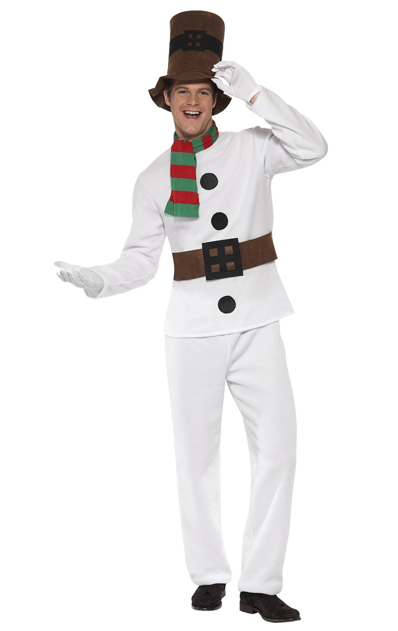 The Snowman Suit Costume is made up of a white jacket that features black buttons down the centre and a printed belt around the waist. It’s accompanied by matching white trousers. No snowman would be complete without a striped red and green scarf and tall brown top hat. They complete your snowman appearance perfectly!