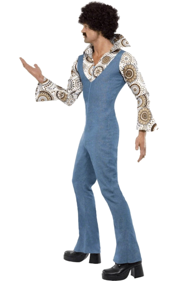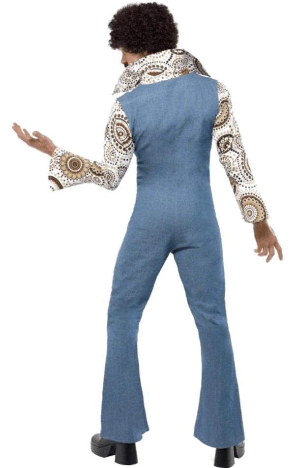 The Groovy Dance Costume includes a denim look, all-in-one, fitted blue jumpsuit with flared legs. It also features an attached brown and white retro patterned shirt with an oversized collar.