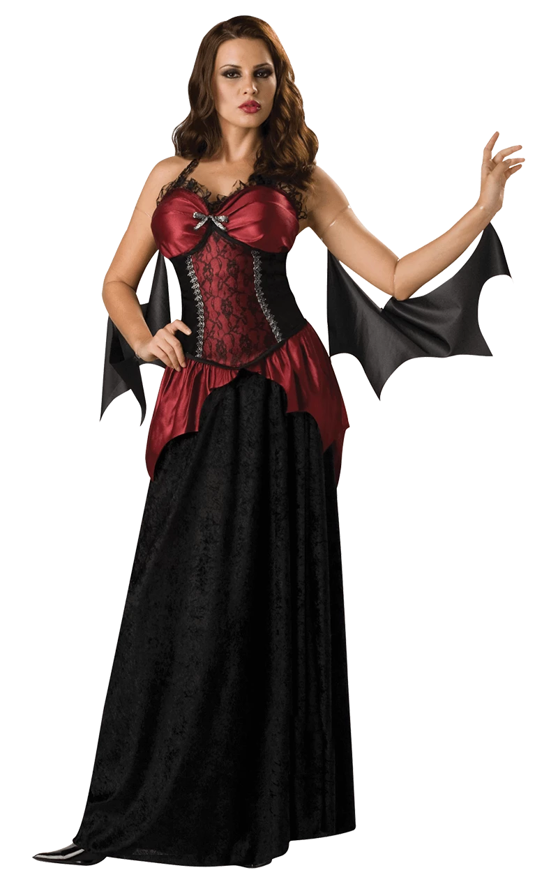 The Vampira Waist Clincher Costume includes a floor-length red and black dress with a satin red corset style top, featuring lace detailing, a ruffled bust and a silver bow. Completing the look is a pair of sensual bat drapes on the arms.